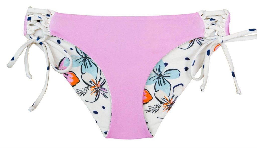 Reversible Eco-friendly, Sustainable Swim Bottom, Side Ties - Malia Tropical Flowers/Orchid Solid