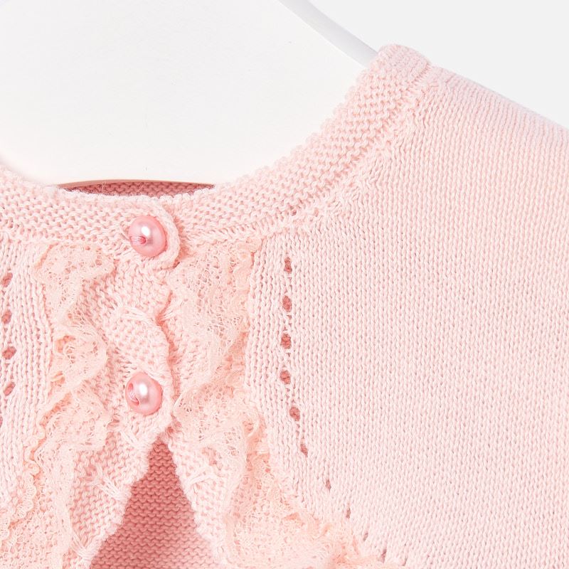 A soft cardigan with sweet little lace ruffle details and cute buttons for a little dressier look. Cropped length to show off any beautiful dress underneath.