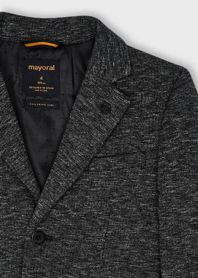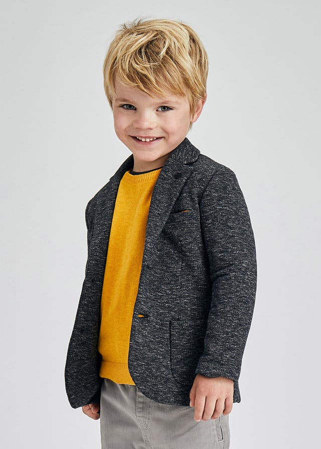 Wear this fun black long sleeve blazer buttoned up or open with a cool graphic t-shirt underneath for those cooler days. Fitted slim fit for a more tailored look. Wear this as a layering piece to help your little boy look stylish and comfy.