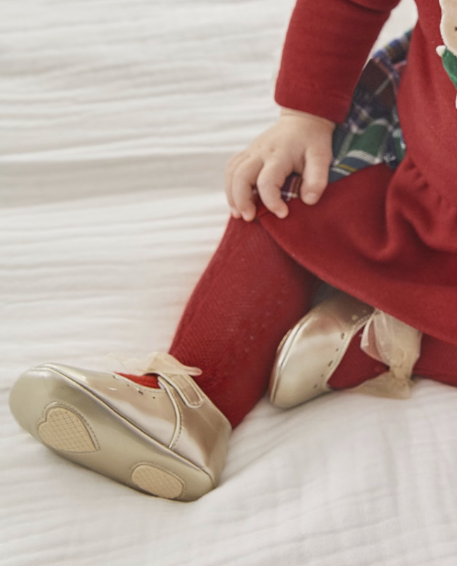 Cute and stylish Mary Jane shoe. Easy to slip on and off. Soft-soled and flexible but with some extra support for their growing world and obstacles, to help baby's feet grow naturally without binding but yet protected.