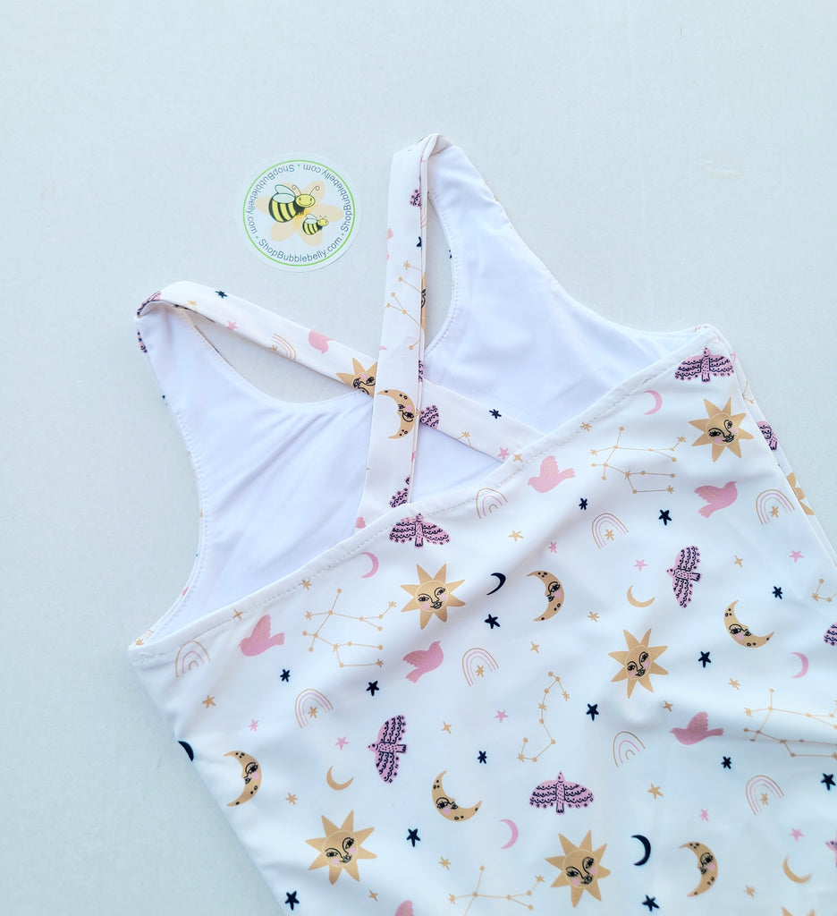 Bird & Bean Onepiece Criss Cross Swimsuit, Sun/Moon/Stars