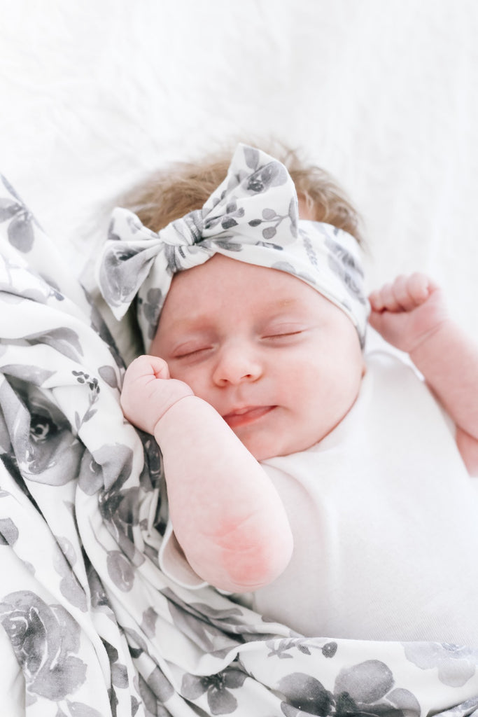 Copper Pearl Knit Headband Bow, Black and White Floral Rowan