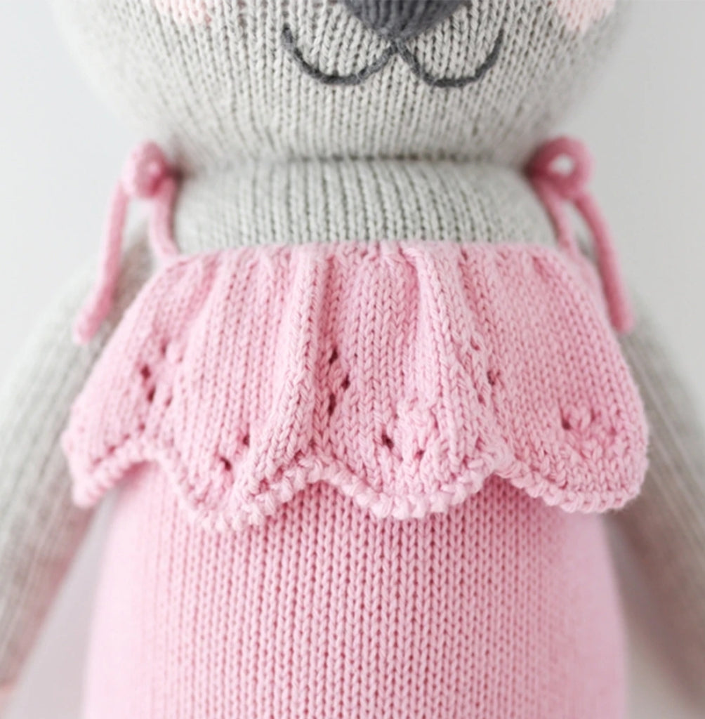 Handcrafted with love by women artisans with fair trade labor and sustainable living wages. Each doll is carefully hand knitted with impeccable details and quality so this will be a cherished toy for many years to come. Soft, cuddly, and easy care.