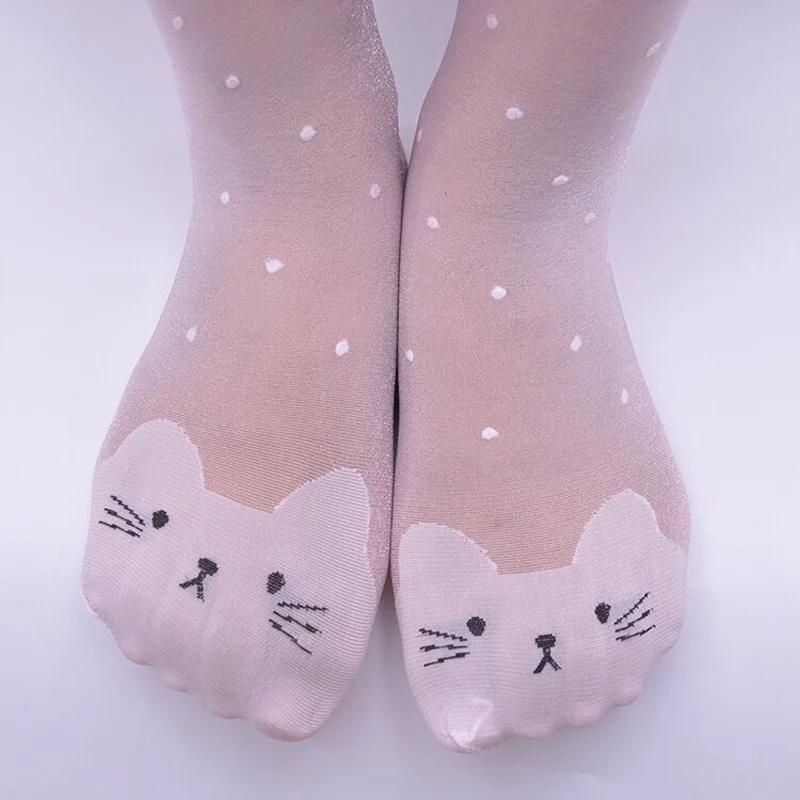 The cutest kitty face textured tights to complete any outfit as the weather gets chillier. These tights are an essential accessory for any little girl. Kitty faces on toes and white polka dots running along the tights.