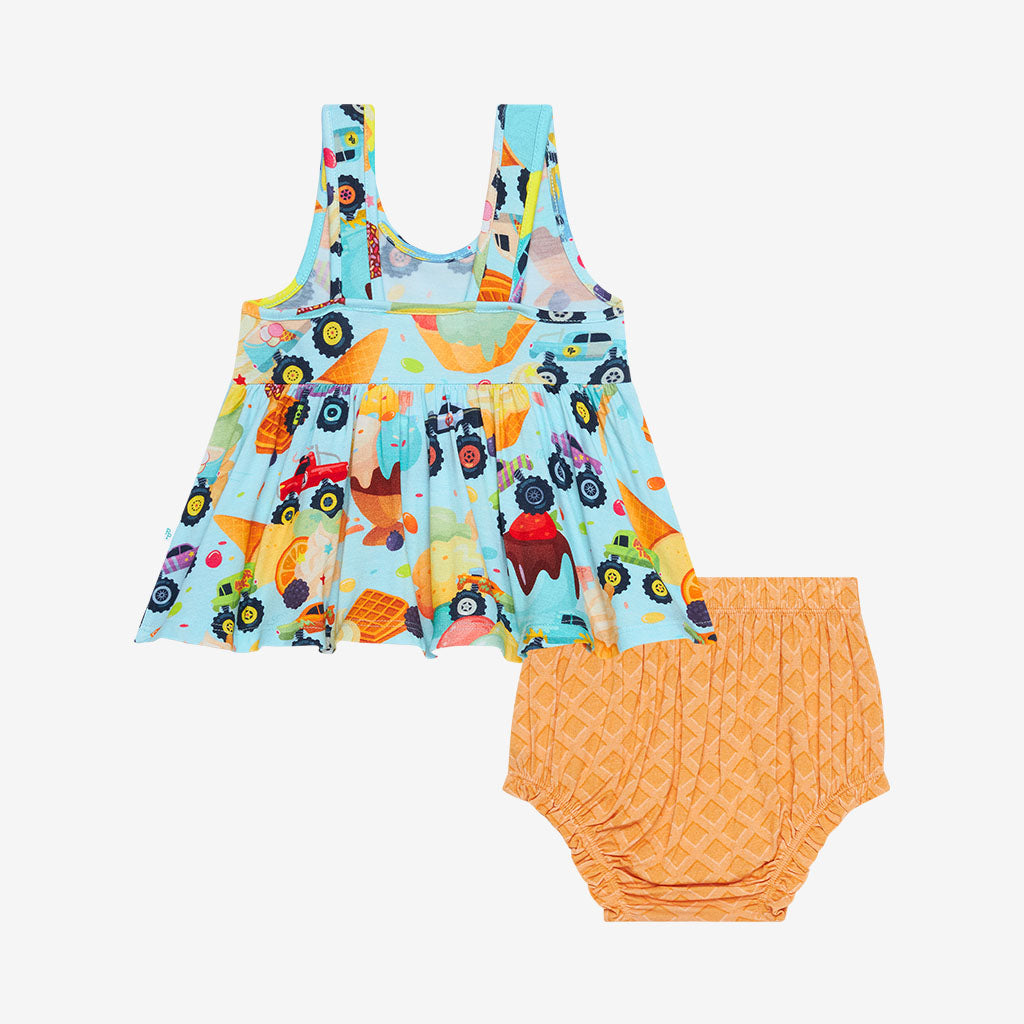 Posh Peanut Bamboo V-Neck Tank Top Peplum & Bloomer/Bummie Set- Monster Trucks & Ice Cream