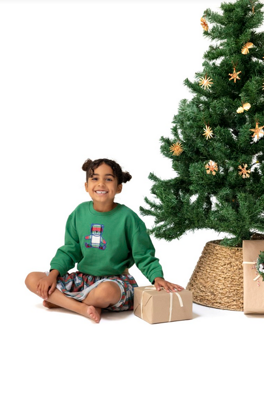 Angel Dear Drop Sleeve French Terry Sweatshirt - Embroidered Plaid Teddy Bear