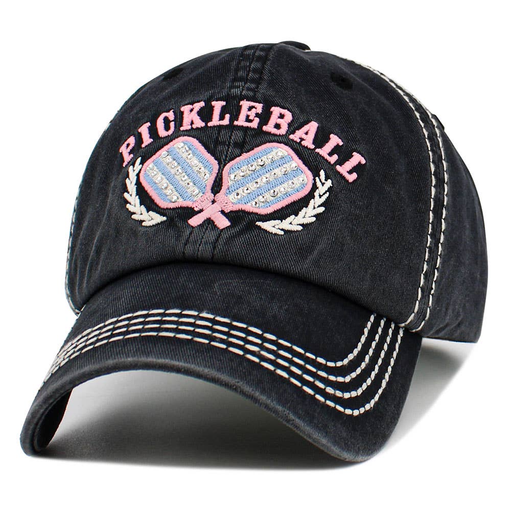 Pickleball Vintage Style Baseball Cap, Double Paddle Embroidered: Studded Black, Powder Blue and Pink