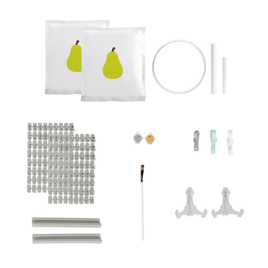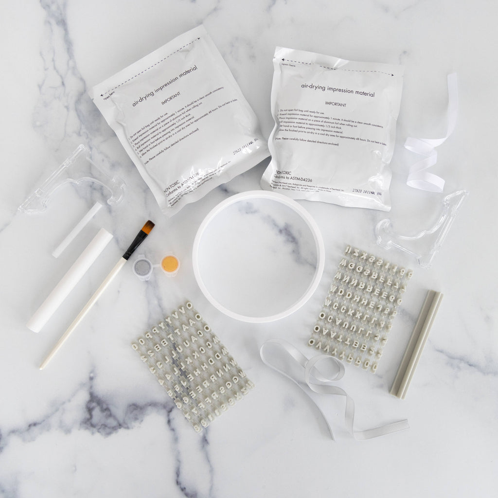 • No Mixing, No Baking, No Mess: This clay casting kit includes everything you need to make a lasting impression. Includes 2 clay kits, 3 neutral colored ribbons (gray, white, and mint), 2 clear acrylic easels, 2 letter sheets, 2 straight line trays, silver paint, gold paint, and 1 paintbrush, instructions.