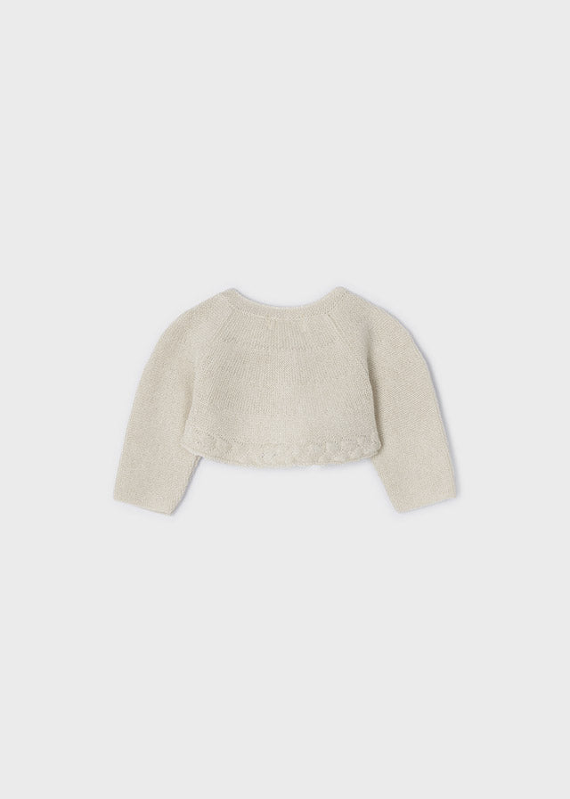 Champagne ivory laced formal cardigan with a subtle touch of sparkle includes two front functional buttons and decorative elements. Layer over Mayoral Girls Ivory Laced Dress (#1867), sold separately.