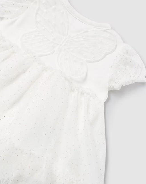 1629 Baby Girl Tulle Bodysuit Dress w/3D Butterfly Wings & Headband Crown, White