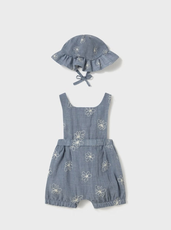 1665 Infant Girls Overall Bubble Romper w/Sun Hat - Embroidered Soft Denim