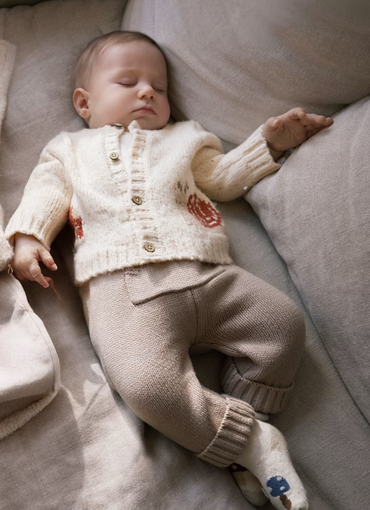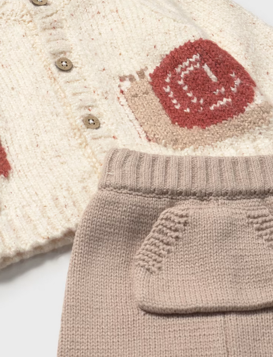 2571 Baby UNISEX Knit 3PC Set, Oatmeal Cardigan, Kangaroo Pants and L/S TShirt, Snail and Mushroom