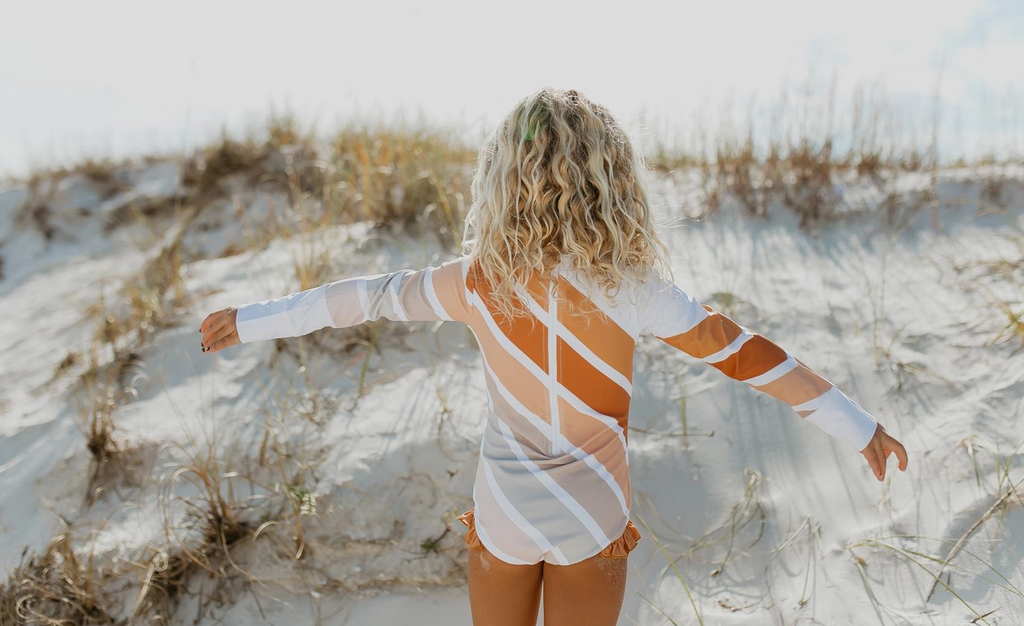 Onepiece full back zipper swimsuit with built-in rash guard. Modern neutral tones in this beige striped rainbow print. Clean lines and great coverage to keep your girl looking fabulous and protected from the harsh summer sun.
