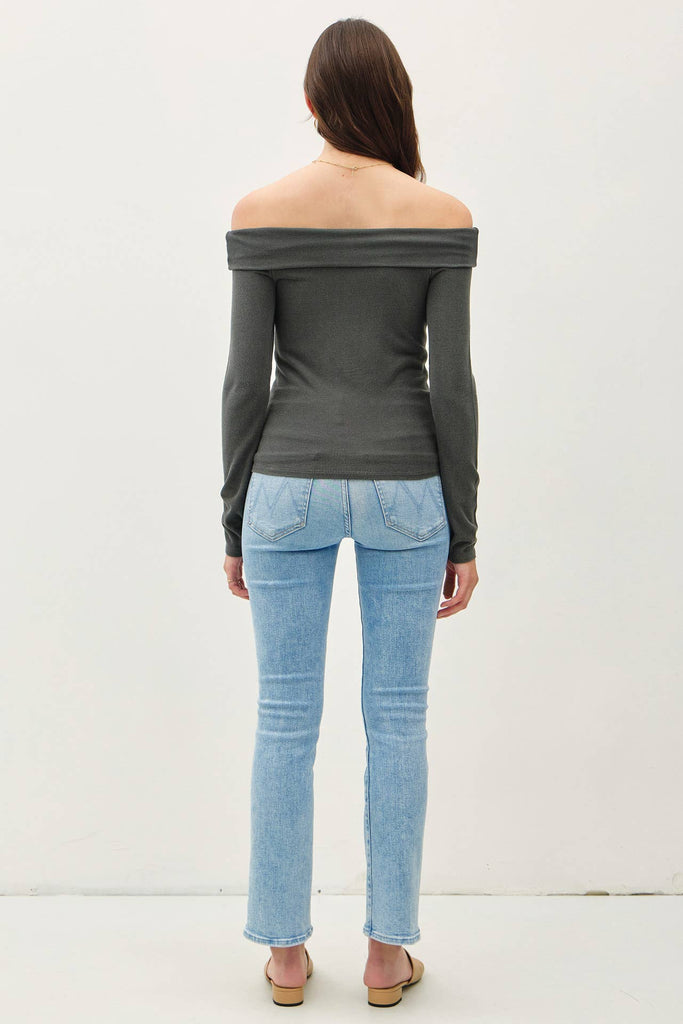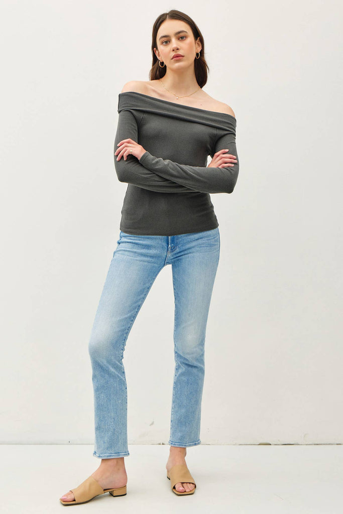 Women's/Teens Soft Solid Off Shoulder Long Sleeve Fitted Top: Charcoal
