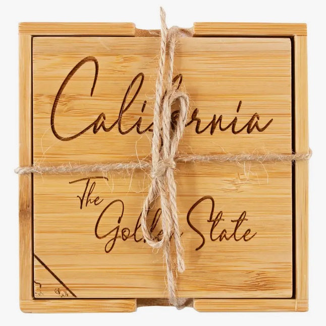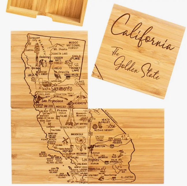 State of California bamboo puzzle and 4 piece coaster set is a fun new take on the essential drink and bar serving needs.