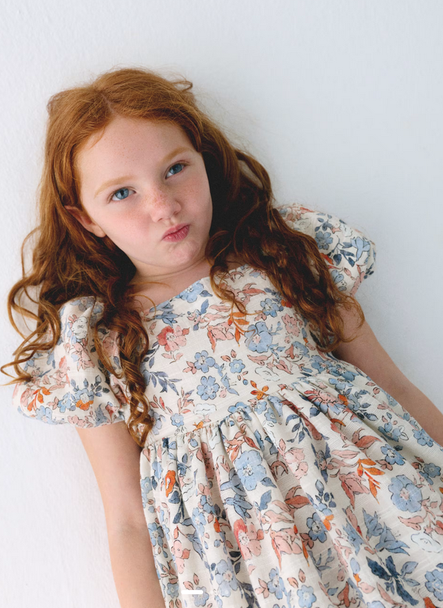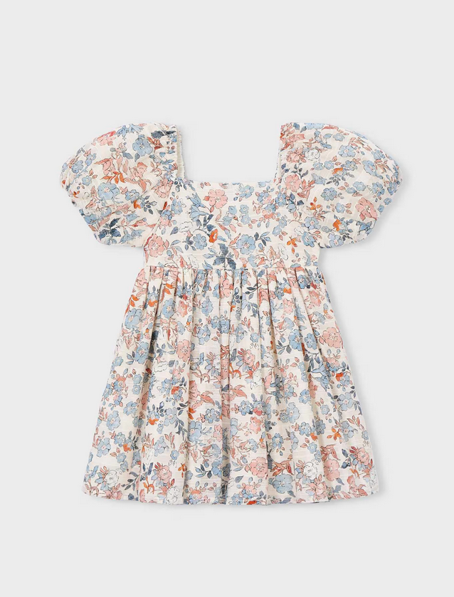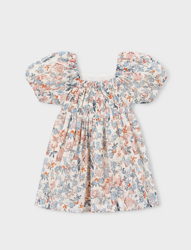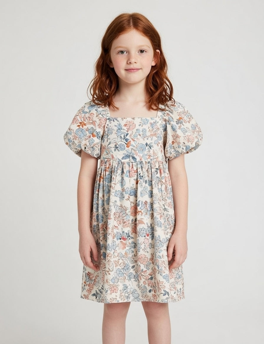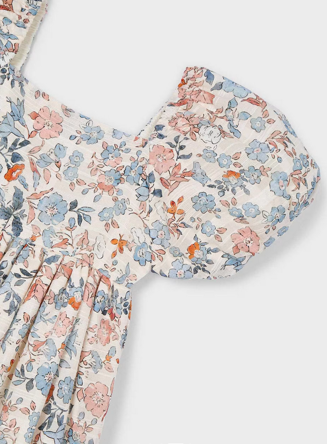 3928 Mini Girls Puff Sleeve Floral Print Dress - Salmon and Ocean Blue
