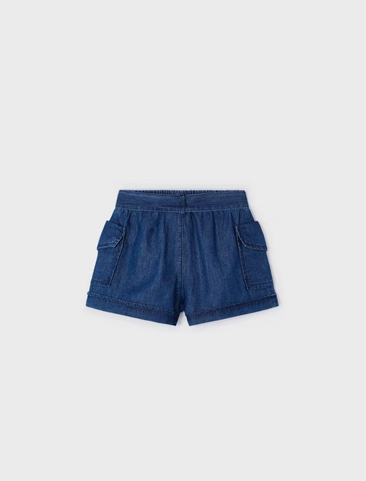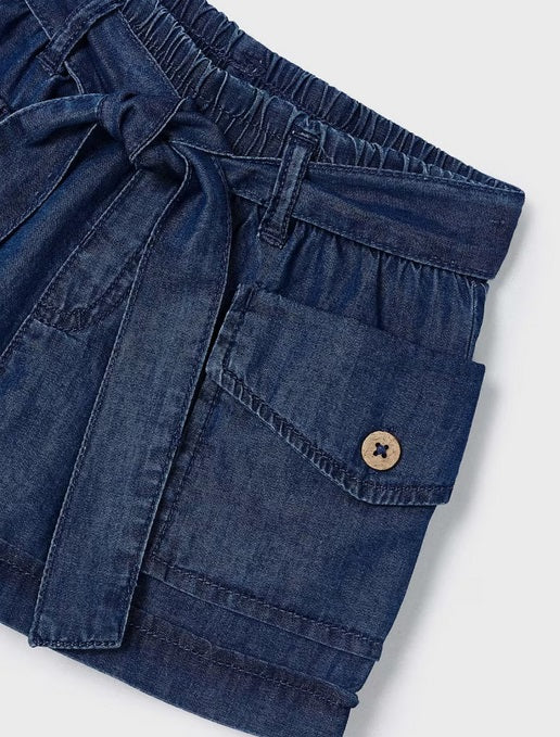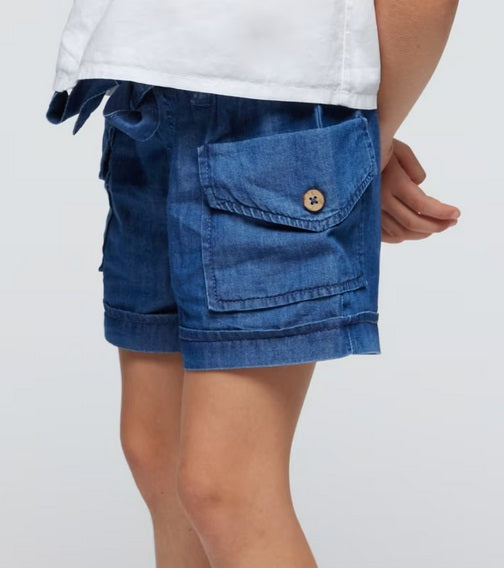 3252 Mini Girls Sustainable Paperbag Tie Waist Soft Denim Cargo Shorts - Dark Wash