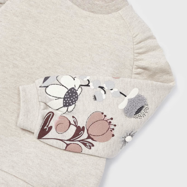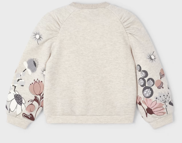 4403 Mayoral Mini Girls Eco Embroidered Floral Puffy Sweatshirt - Stone/Pink