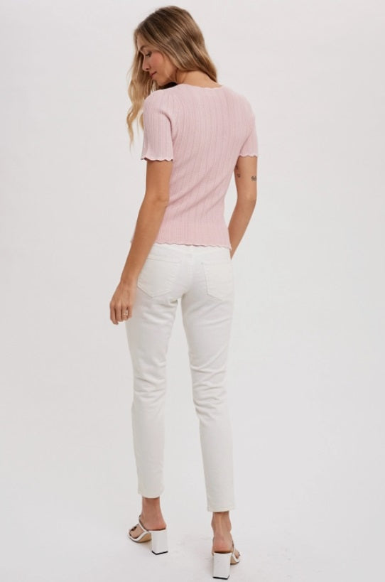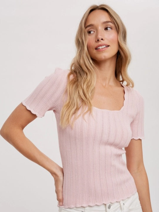 Blu Ivy Scalloped Hem S/S Knit Top, Dusty Pink