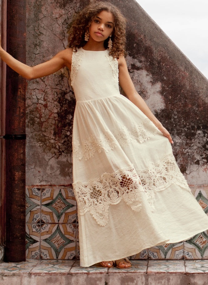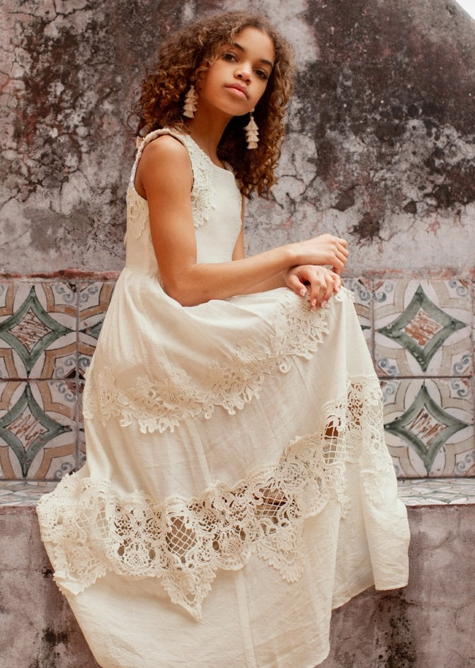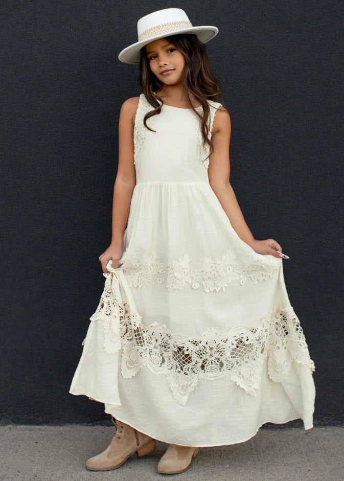 Elegant, whimsical, and playful. Full length dress with gorgeous guipure lace detailing throughout the front, back, and full length skirt.