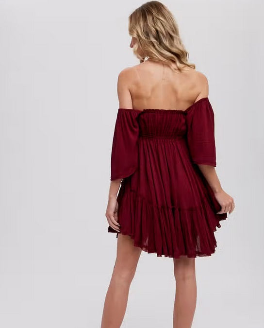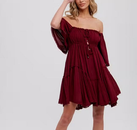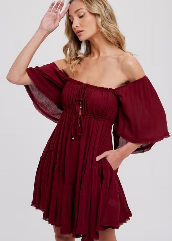 Women's/Junior Adjustable Ruffled Ruched Mini Dress w/Pockets - Wine Red