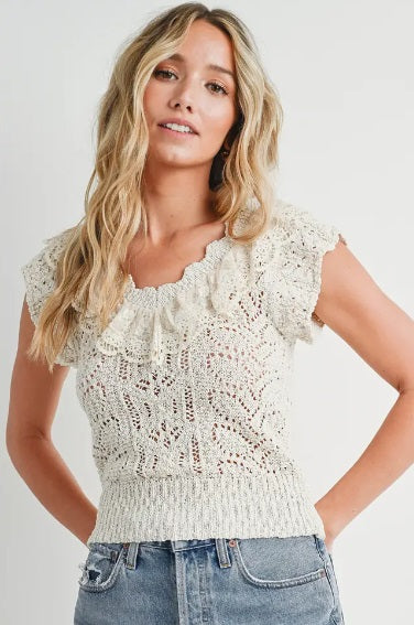 An eyelet sweater knit top blends cozy comfort with delicate details. Short-sleeved and adorned with lace-trimmed ruffles at the neck, it offers a touch of classic femininity. The sweater knit material adds texture and warmth, while the eyelet design brings an airy and charming vibe to the garment. This combination makes it a versatile piece that can transition between seasons and occasions with ease, adding a touch of elegance to any ensemble, casual or dressy.