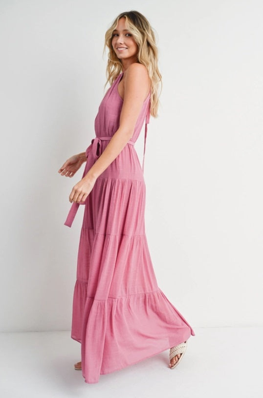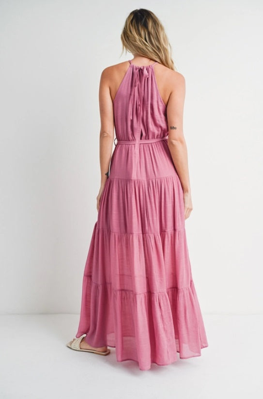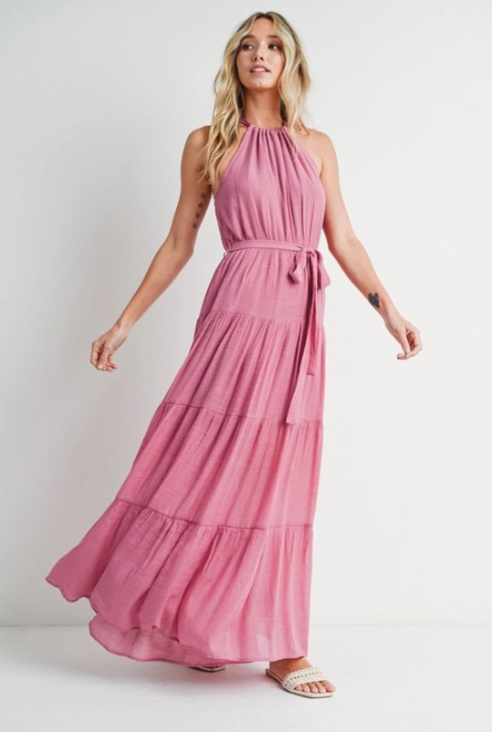 Women's/Junior Tiered Halter Tie Waist Maxi Sun Dress, Orchid Pink
