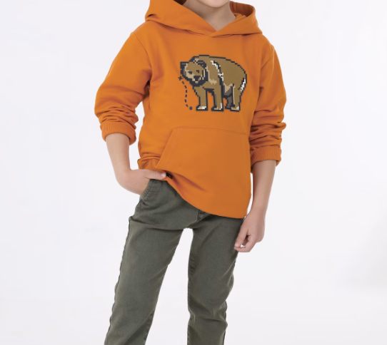 This adorable bear sweatshirt is perfect for your little boy! Cool and trendy, great for a day out with the family. This sweatshirt has a hoodie, a front pocket, and a rubber bear graphic on the front.