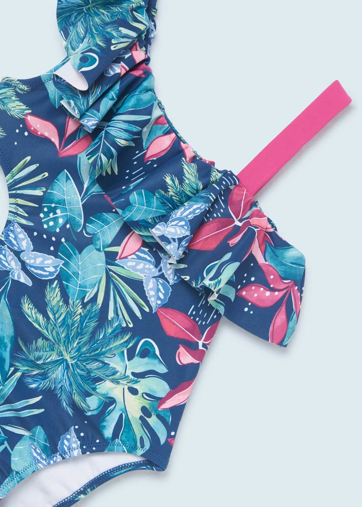 Breathable and quick drying onepiece swimsuit with flutter ruffles around the shoulder and upper hem.