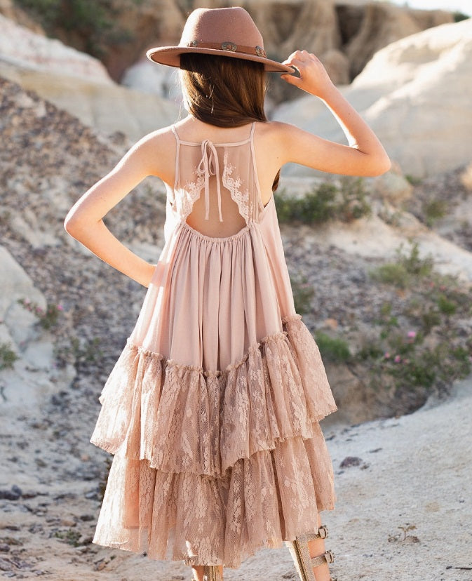 Elegant, whimsical, and playful. This midi length tiered layers of lace is just slightly shorter in the front than the back. The gorgeous detail of the open back and mesh lace panel leaves a breath taking impression.