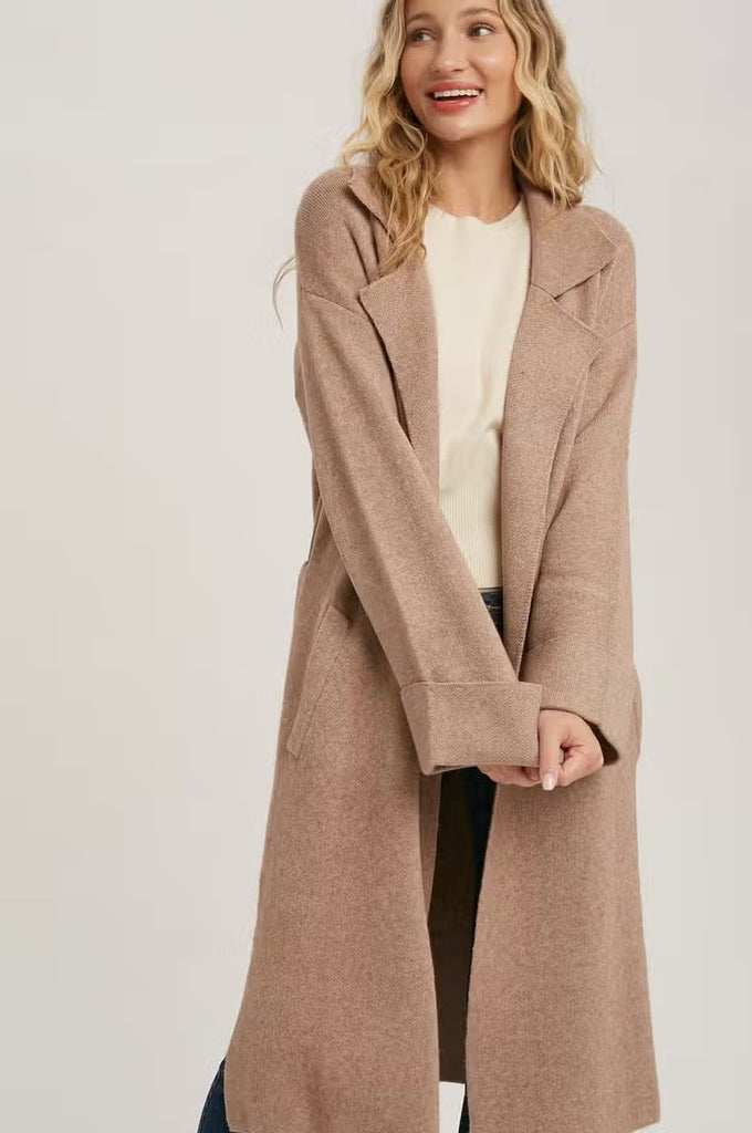 Introducing an effortless knitted trench coat that seamlessly blends style and comfort. This coat features a lapel collar and long, wide sleeves that exude a sense of sophistication and ease. The side slits add a modern touch, allowing for easy movement and a hint of allure. With pockets on the side, this trench coat offers practicality.