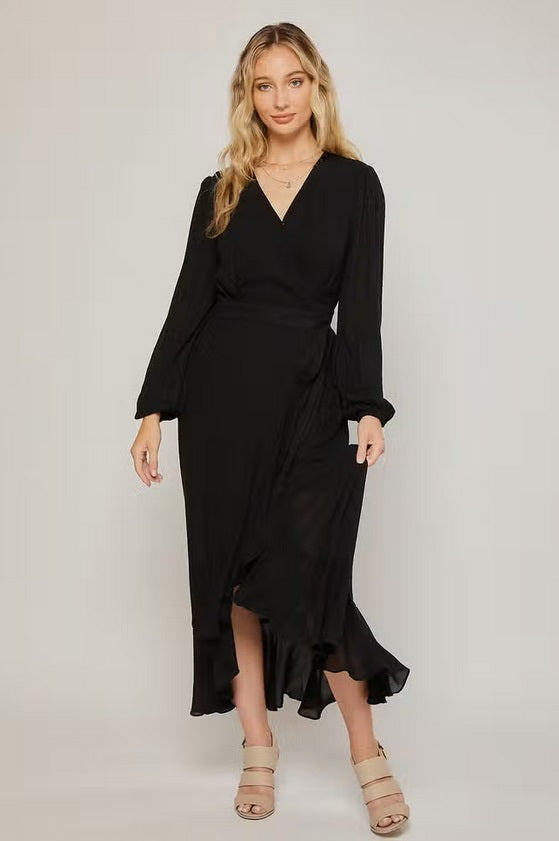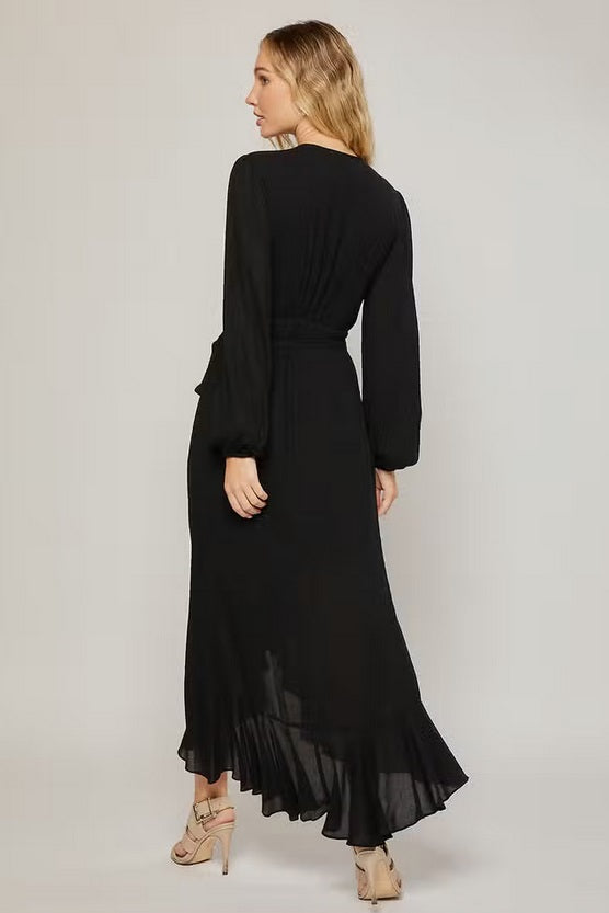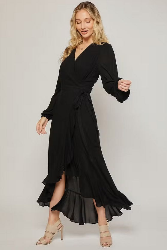 Women's/Junior Ruffled Hem Flowy Wrap Maxi Dress - Classic Black