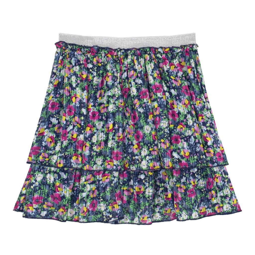 Mini/Tween Girls Tiered Skirt: Multi Navy and Fuchsia Micro Floral with Silver Lurex