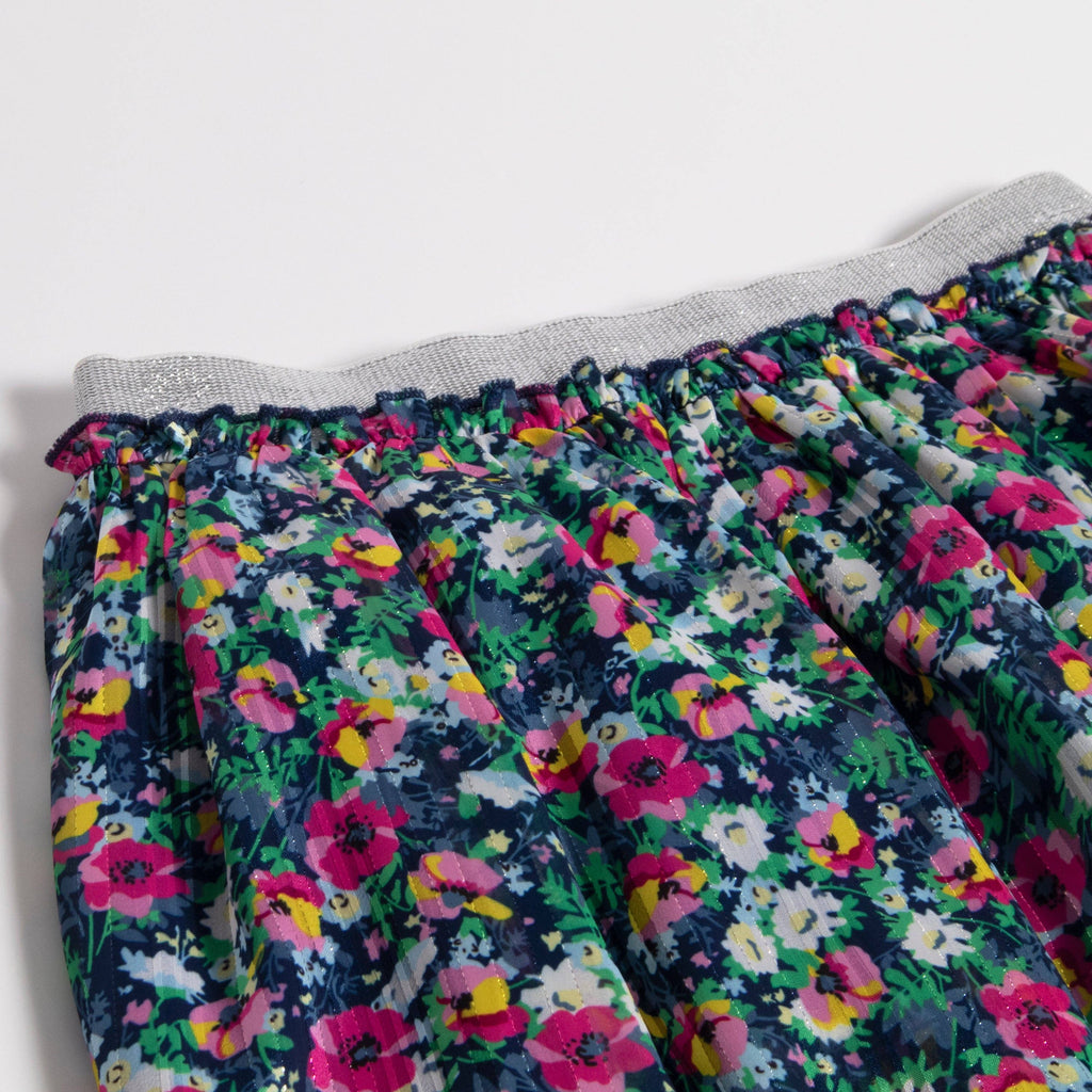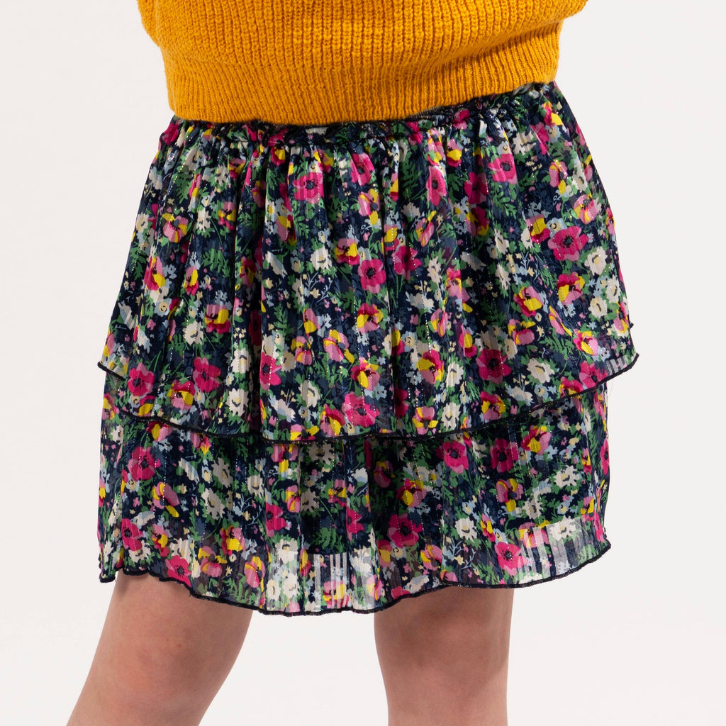 This gorgeous skirt features tiers of vibrant floral fabric featuring a little sparkle with some lurex throughout the fabric and on the exposed elastic waistband. Great for casual school wear or dressed up for an event.