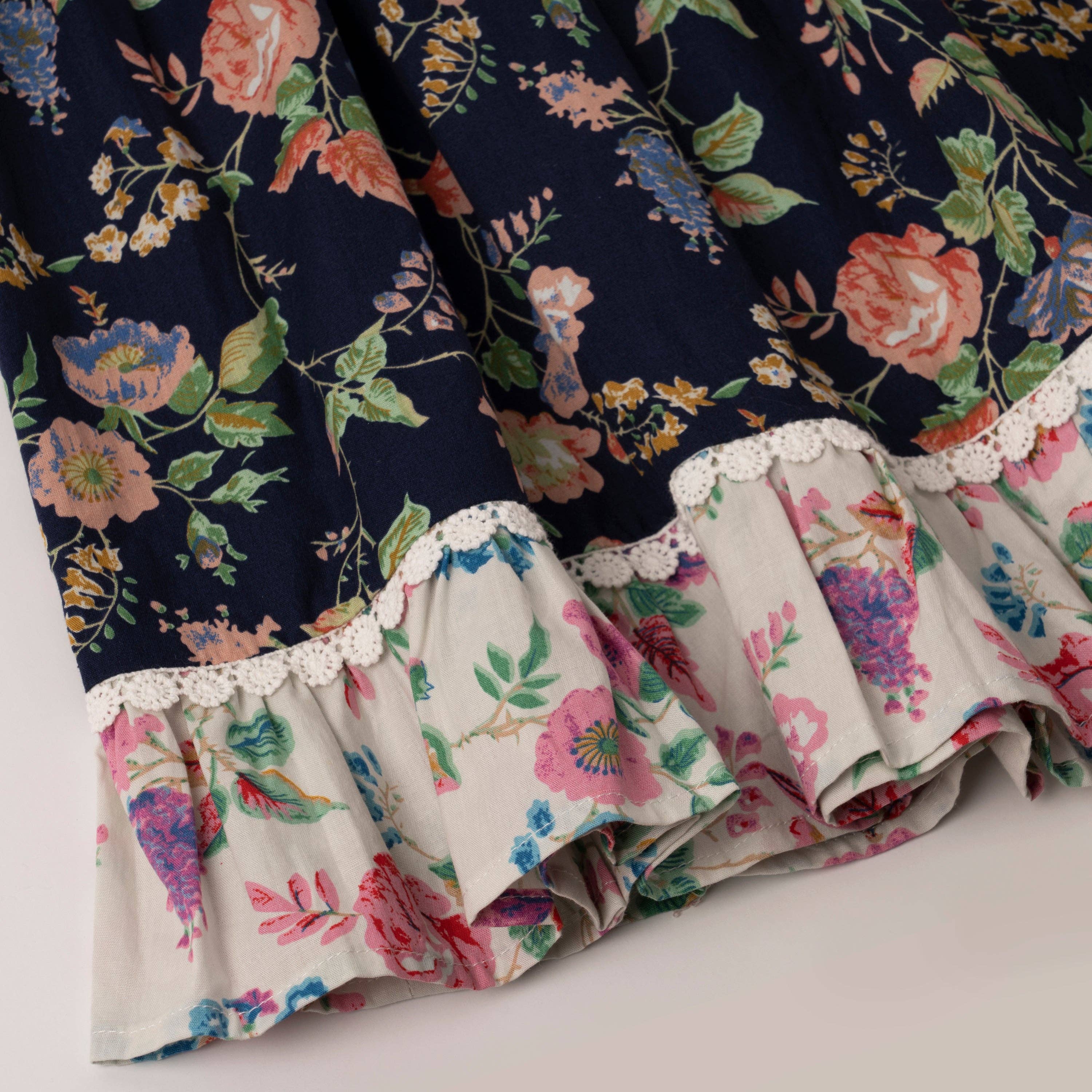 Mini/Tween Girls Mixed Baby Doll Guipure Lace Trim Dress: Multi Floral Ruffled Hem
