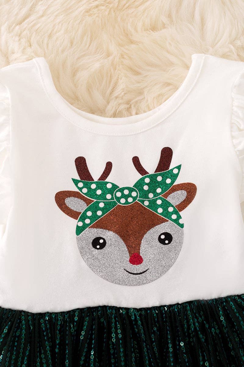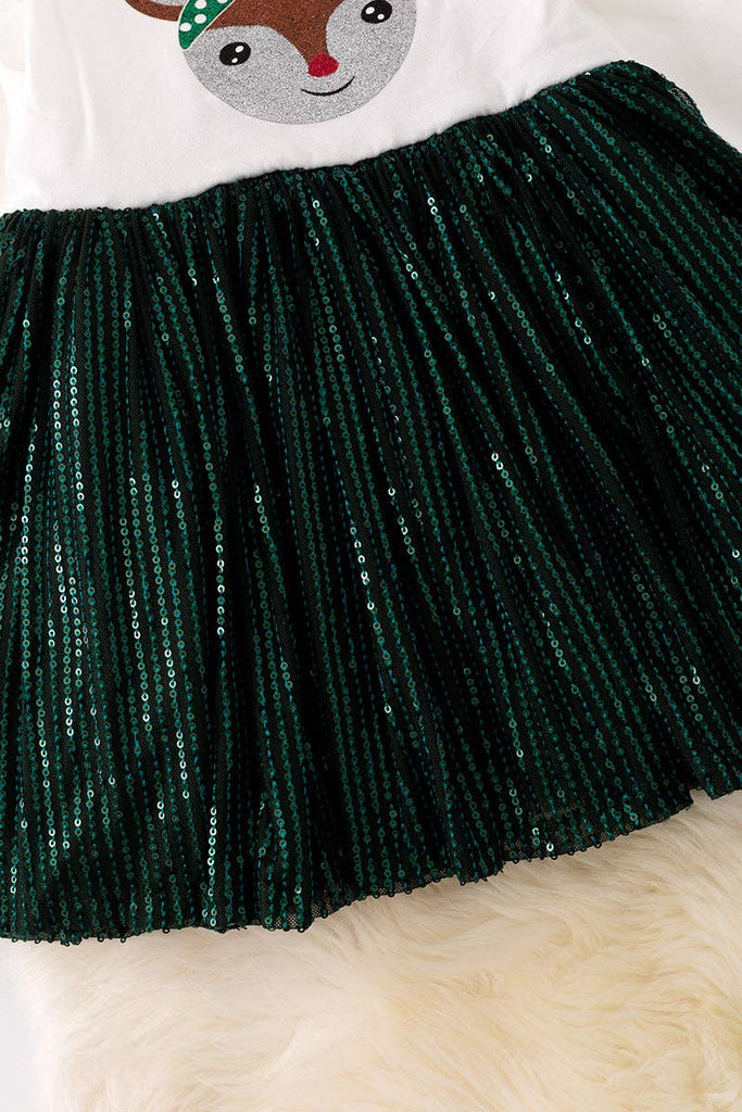 Mini Girls Sequined Skirt, Fawn Print Ruffled Shoulder L/S Dress - Pine Green