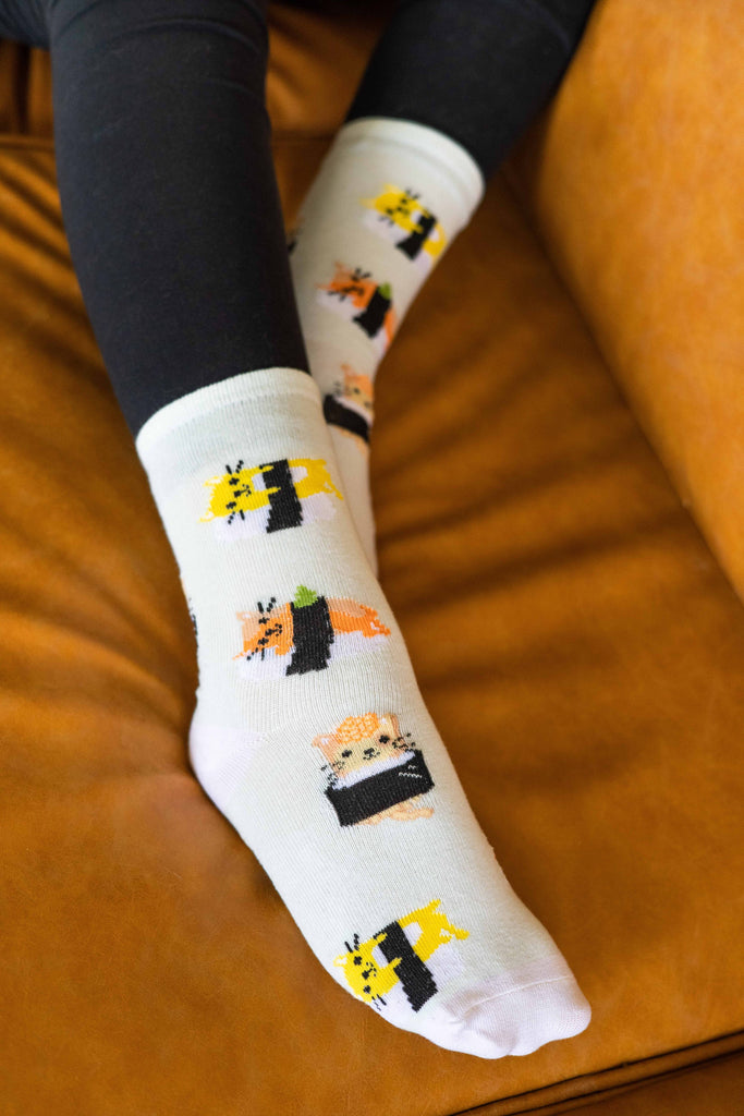 • Includes one pair of fun socks decorated with colorful cats, each in their own sushi roll!