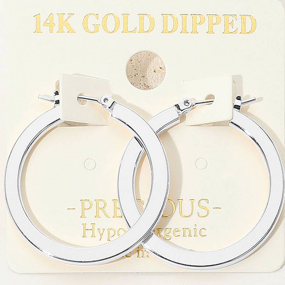 14K Gold Dipped Hypoallergenic Flat Pin Catch 1.25" DIA Hoop Earrings: Rhodium Silver