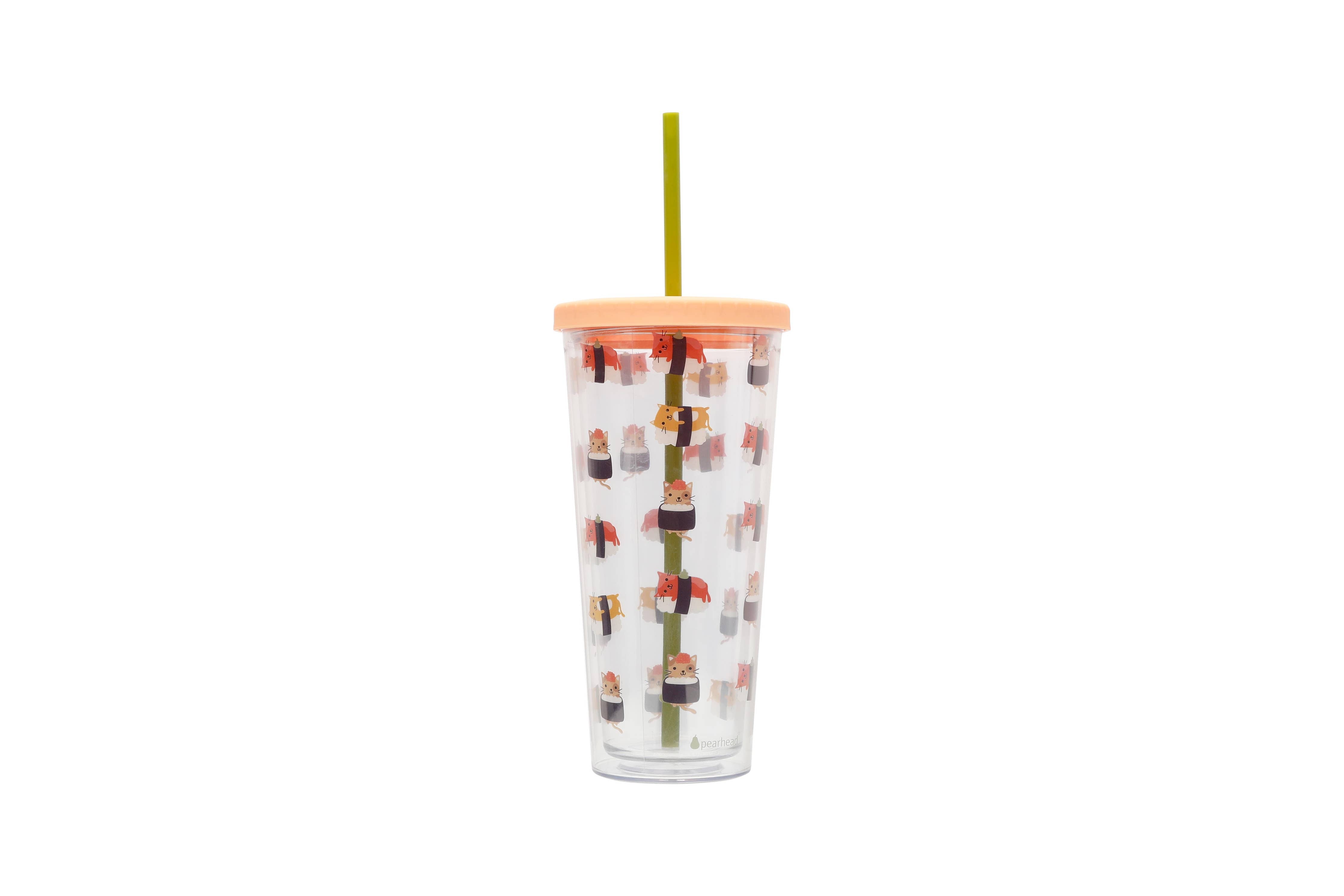 • Includes one 22oz tumbler with peach colored twist on lid and a sage green reusable plastic straw; adorable travel water cup design features colorful cats in sushi rolls!