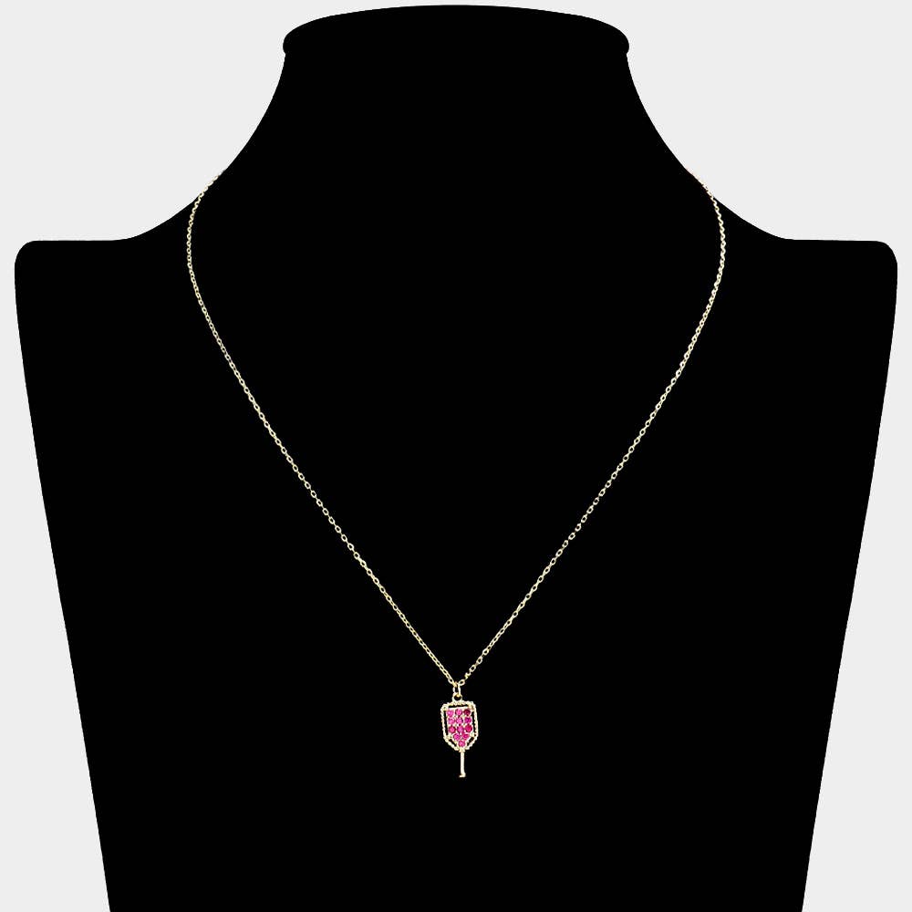 Pave Crystal Stone Pickleball Pendant Necklace: Gold and Fuchsia