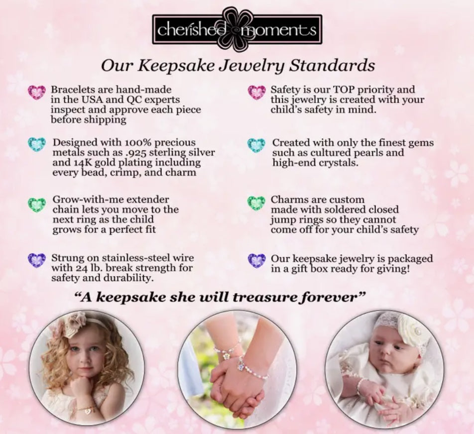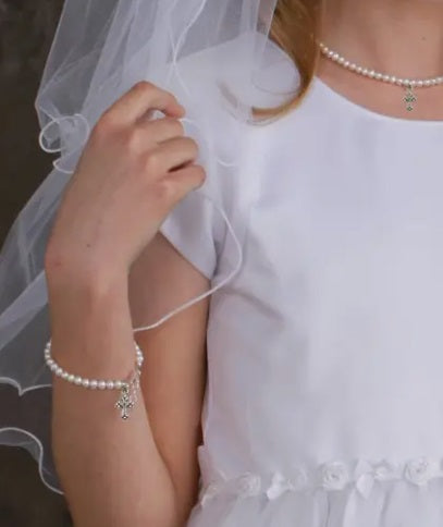 Beautiful keepsake sterling silver bracelet with genuine freshwater pearls and a silver cross - perfect for baptisms, christenings, and communion! each bracelet has an extension chain, as the child grows just move to the next link for a perfect fit. this bracelet is available in three sizes and is great for infants, babies, toddlers, and older girls. This cross bracelet comes in a beautiful gift box. This jewelry is hand-made in the usa. A keepsake she will cherish forever.