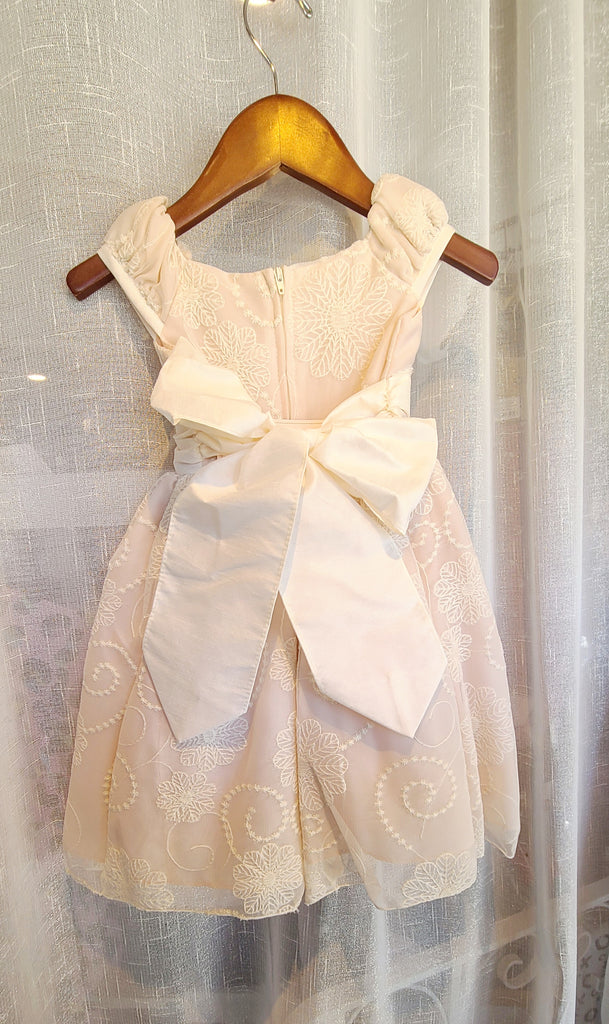 Sweet Kids Puff Sleeve Floral Embroidered Overlay Dress - Cream Peach w/Floral Bow Sash