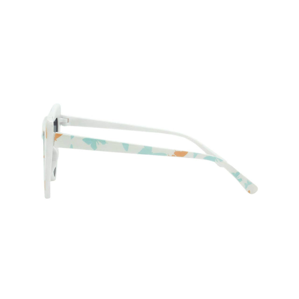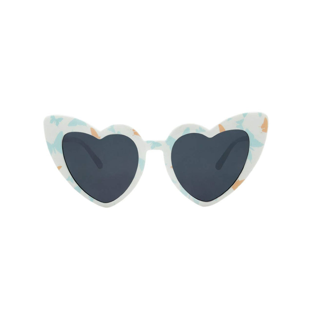- 4PC Set: Gradient Lens on a heart shaped frame, White/Blue/Coral Butterfly Print Frame and Temple, Eye glass protective carrying case with handle, Bucket Sun Hat with Butterfly Design, and reusable purse/beach tote bag (great for carrying beach toys or Farmer's Market finds!)