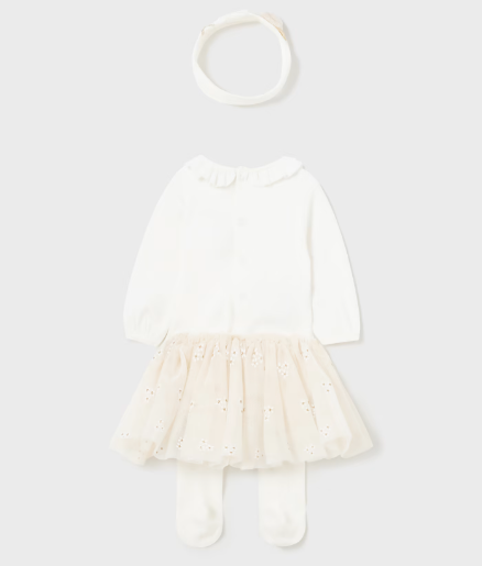 2848 Mayoral Baby Girls 3PC Ruffled Collar Bodysuit Tutu & Headband Set - Soft White & Champagne