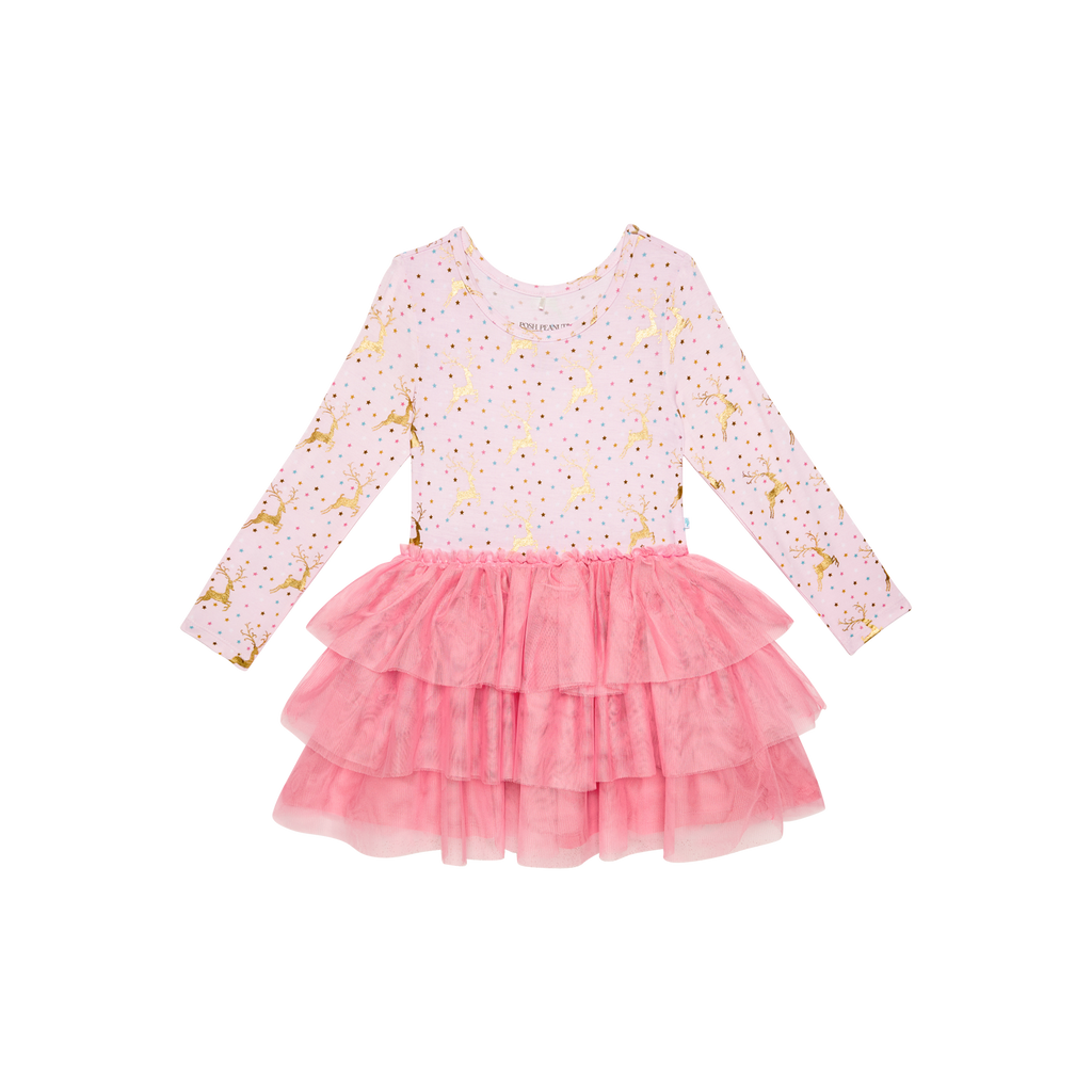 Posh Peanut Bamboo L/S Tulle Twirl Dress - Ryleigh Gold Foil Reindeer