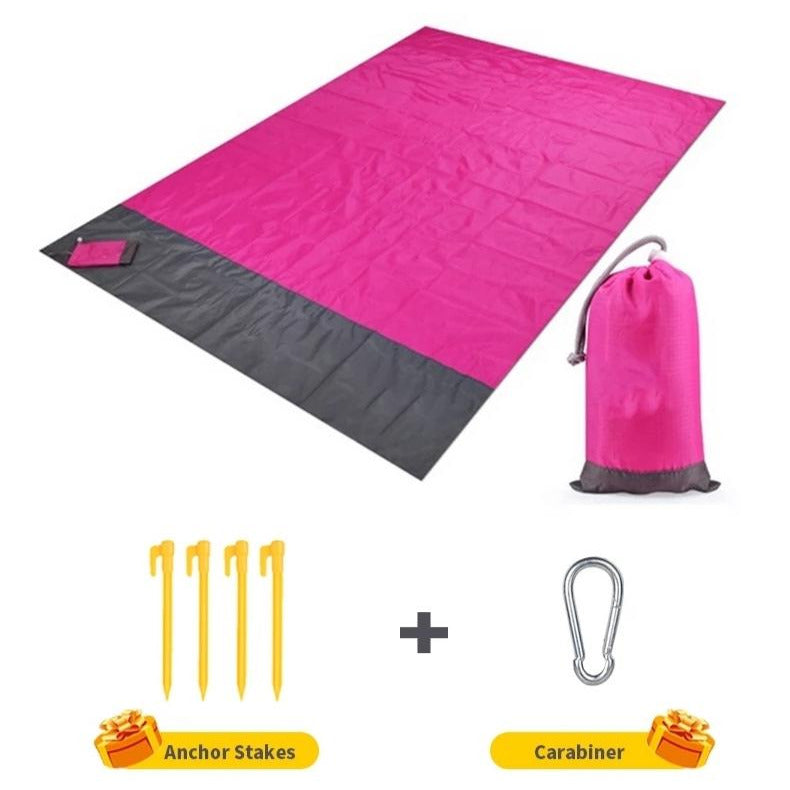Comes with a travel bag, corner loops, 4 stakes to secure the blanket, and a carabiner clip to easily secure to a backpack for camping. Waterproof and sand-free, makes for a more comfortable lounging and picnic spot. Folds up compactly into the carrier bag measuring only 5" x 8" to easily store in the car or bag for on-the-go use.